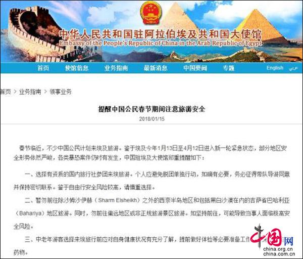 记者近日从中国驻阿拉伯埃及共和国大使馆网站获悉,在春节探亲旅游小高峰期间,不少中国公民计划赴埃及旅游。鉴于埃及于当地时间2018年1月13日至4月12日进入新一轮紧急状态,部分地区安全形势依然严峻,各类暴恐案件仍时有发生,中国驻埃及大使馆郑重提醒如下: